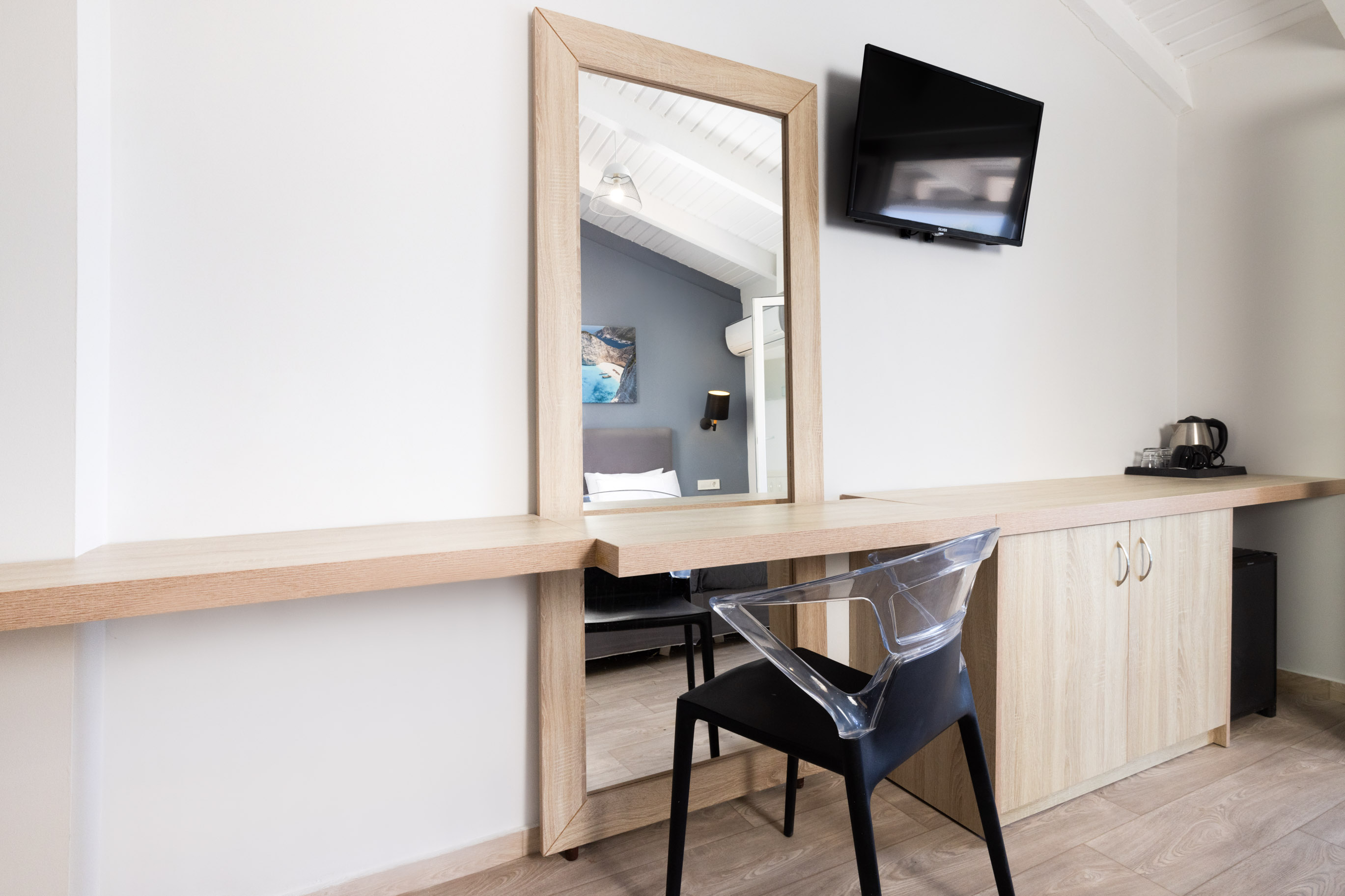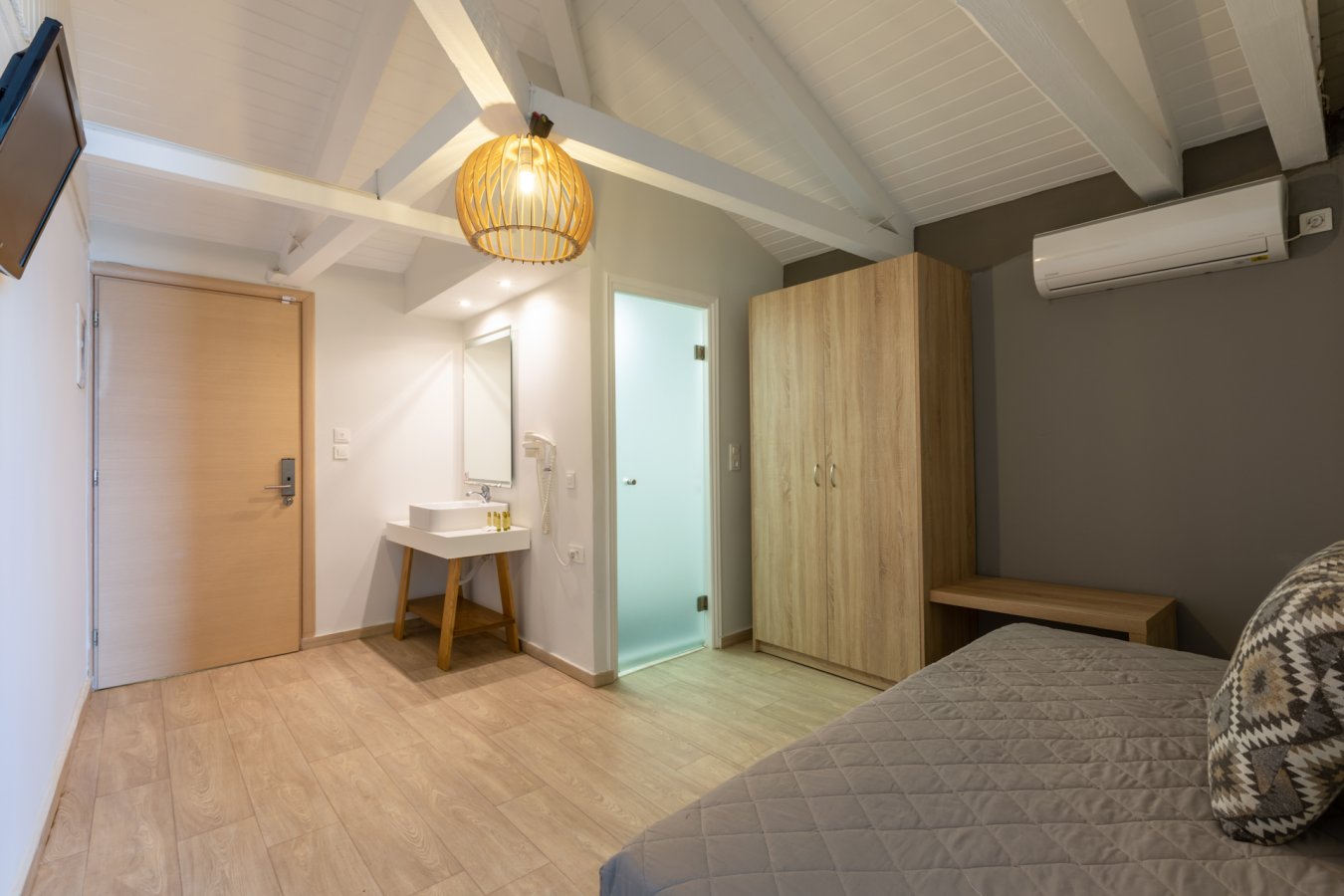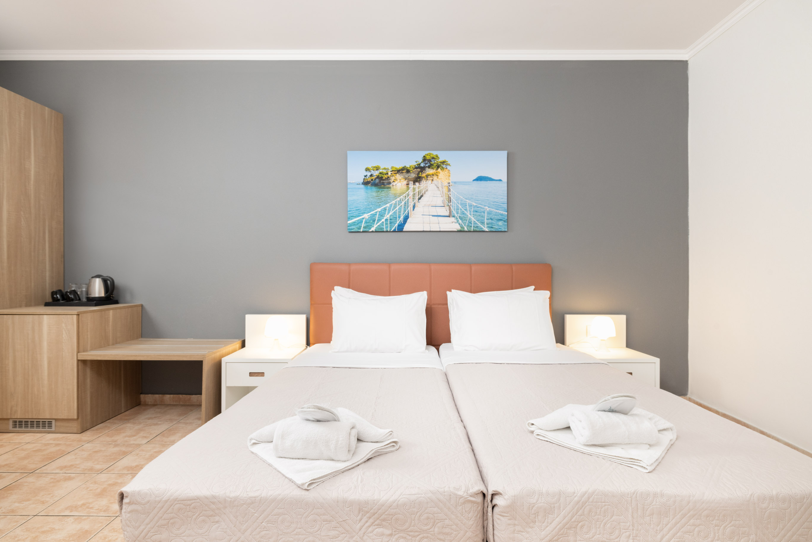Modern and comfortable rooms, fully equipped, with a double bed or twin beds and an extra bed, 14m2-16m2, with pool, sea or land view.