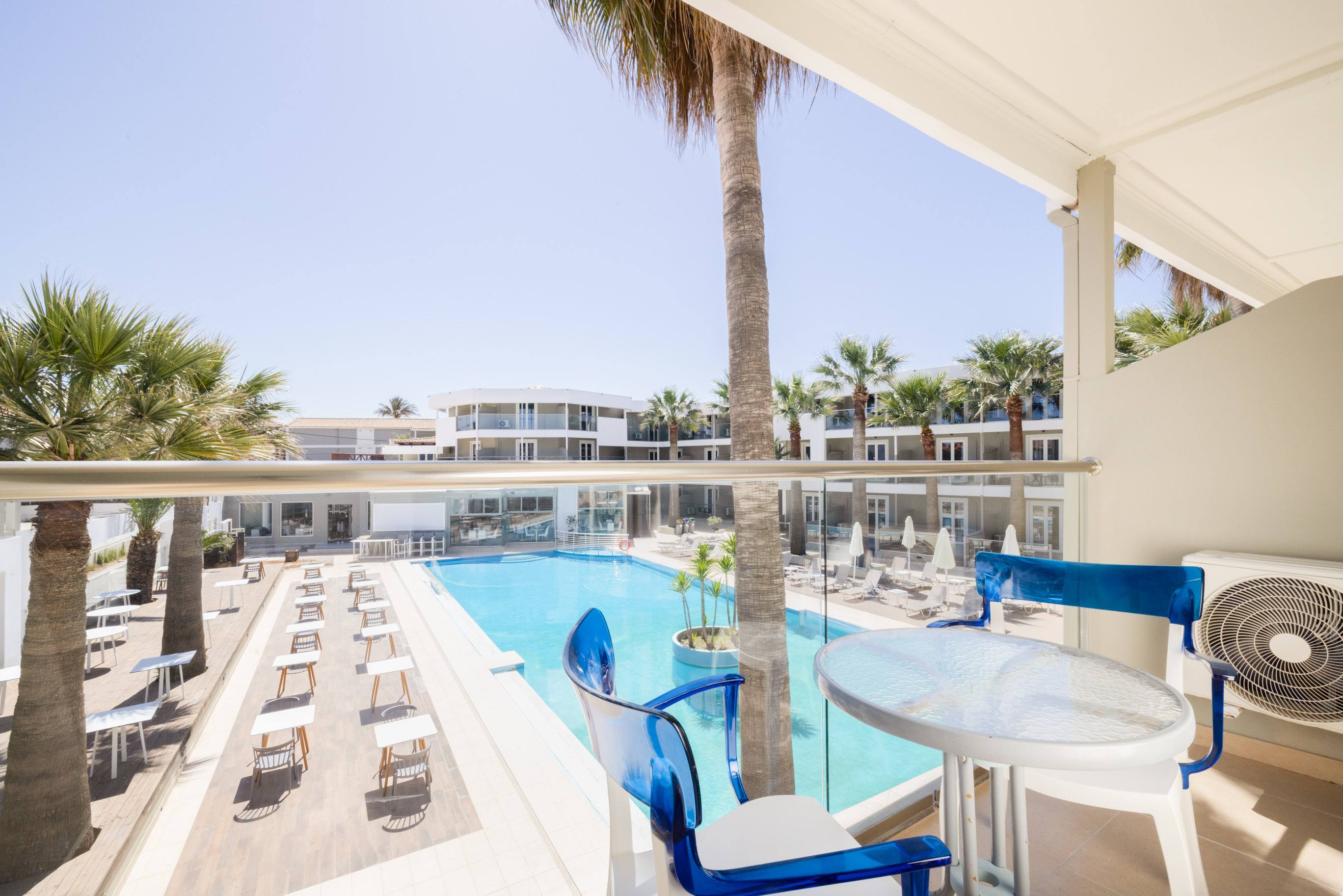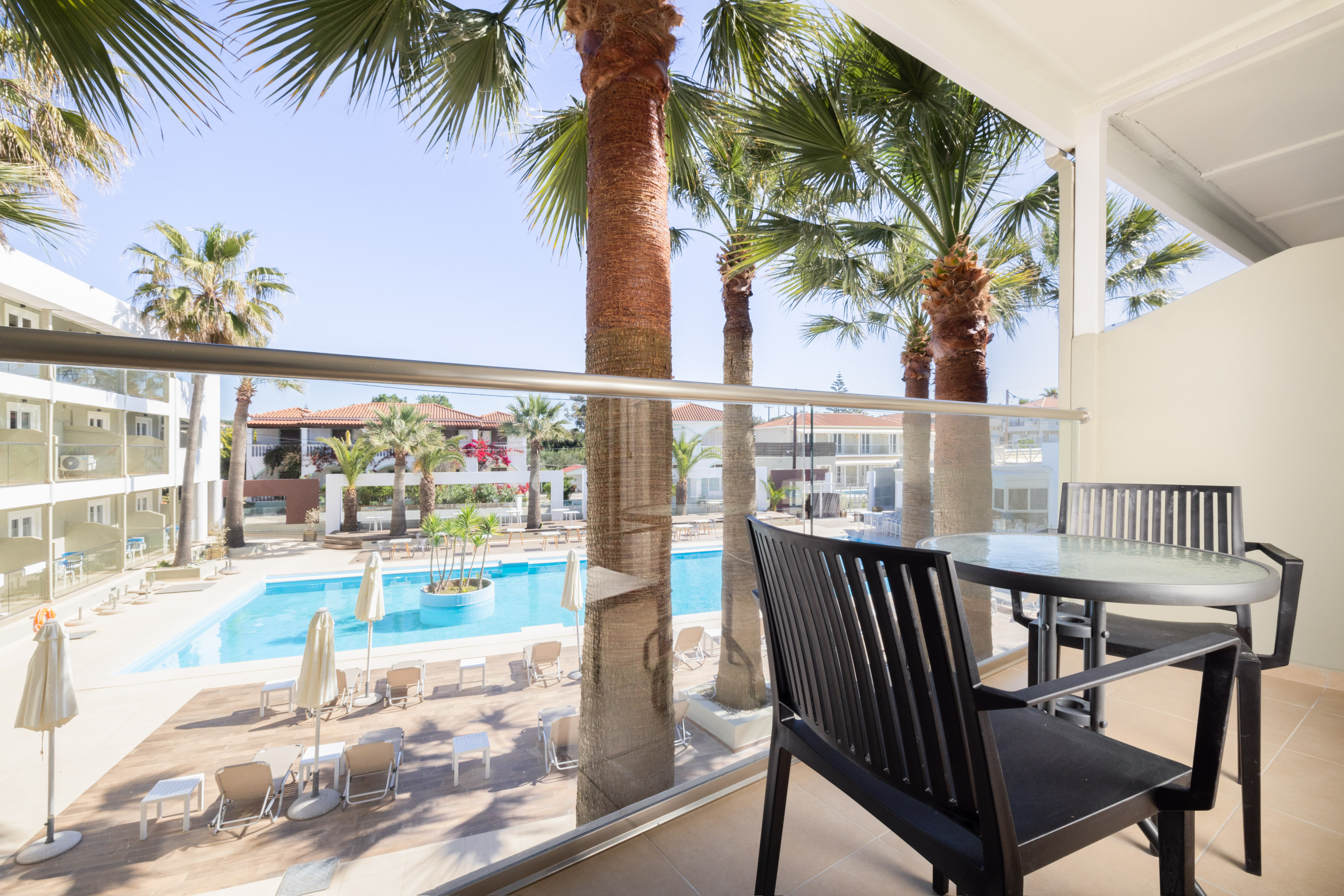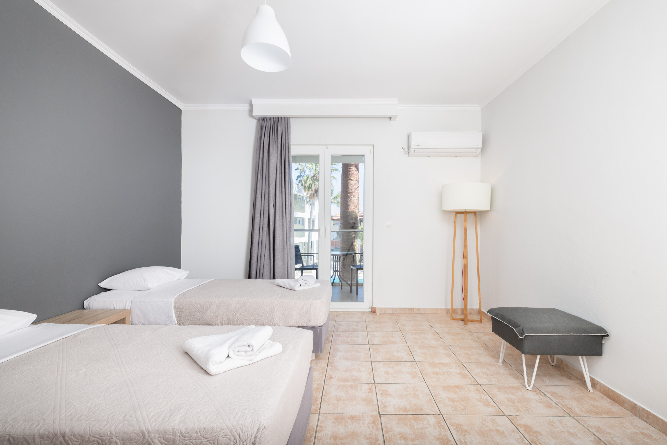 Modern and comfortable rooms, fully equipped, with a double bed or twin beds, a single bed and a sofa bed, 24m2-32m2, divided into 2 bedrooms with a wall, with pool, sea or land view. Designed to accommodate a couple with two children, or three adults and one child.