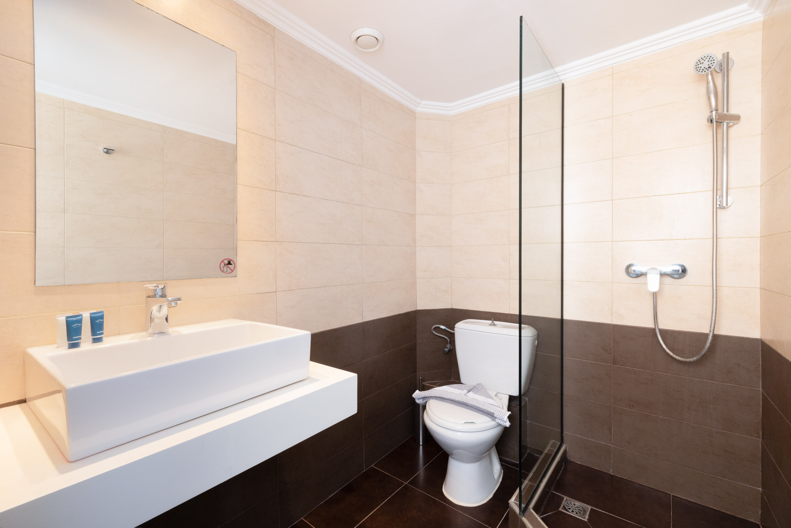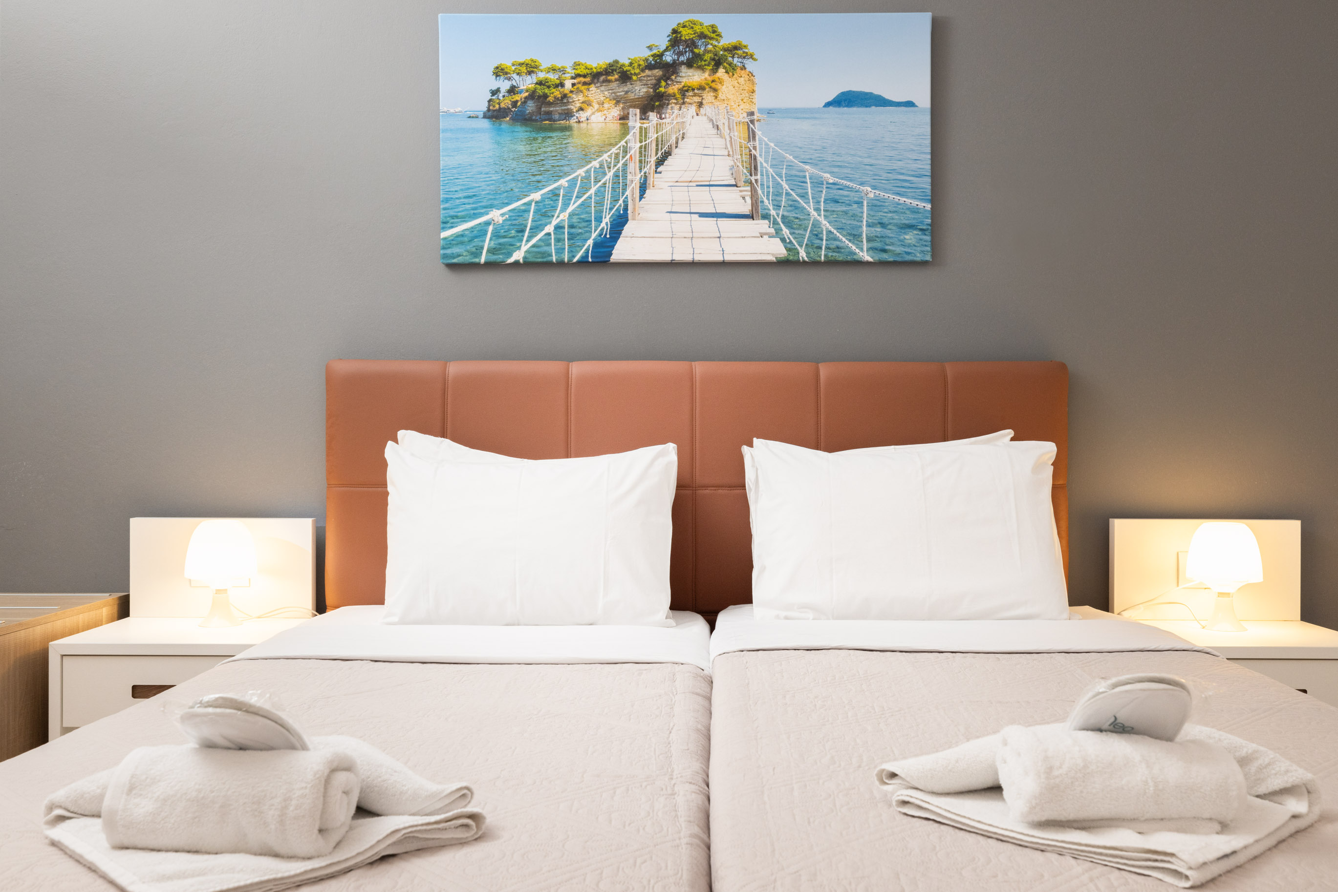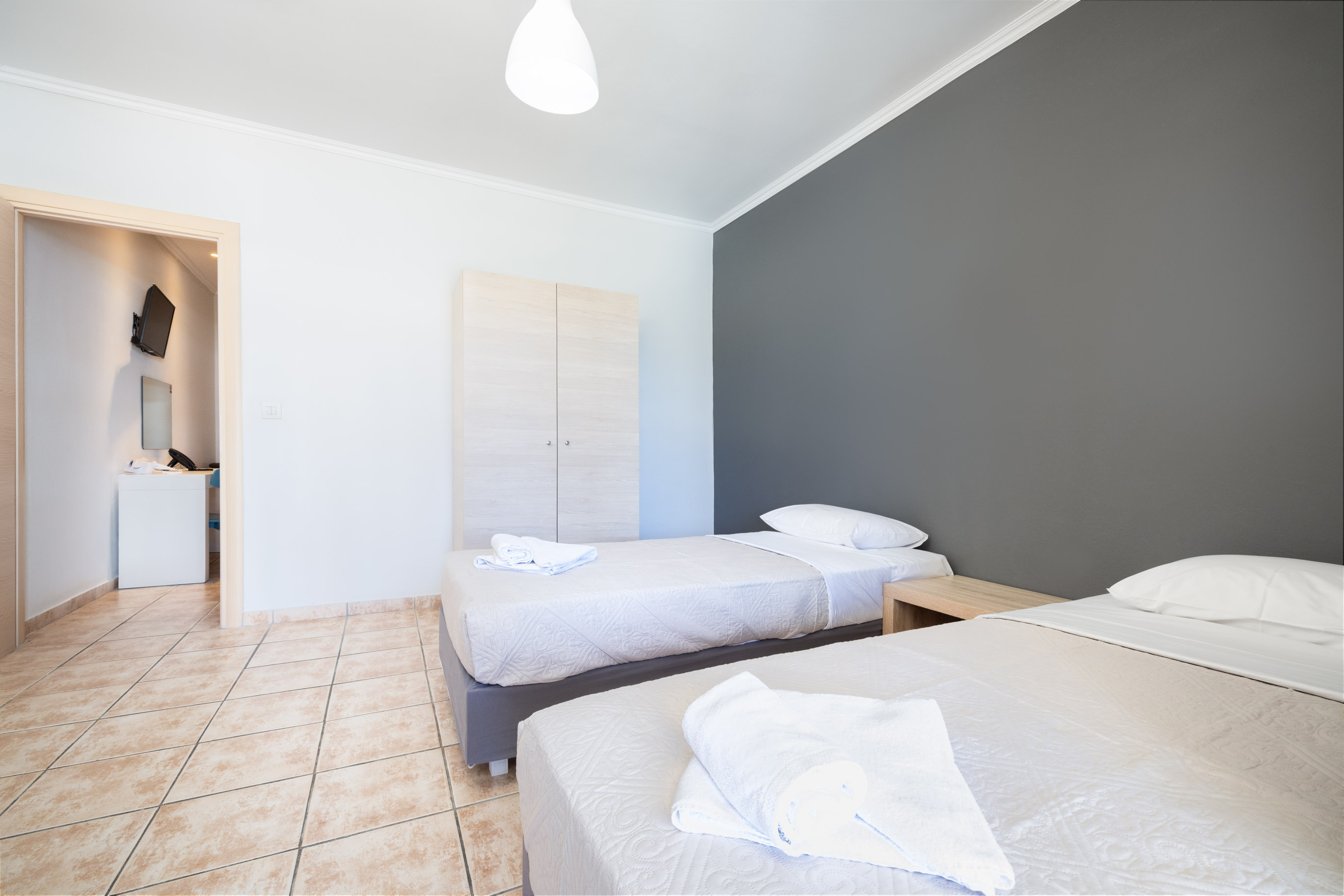 Modern and comfortable rooms, fully equipped, with a double bed or twin beds, a single bed and a sofa bed, 24m2-32m2, divided into 2 bedrooms with a wall, with pool, sea or land view. Designed to accommodate a couple with two children, or three adults and one child.
